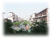 午後、陜西歴史博物館を見学した。ここでは特別閲覧として秦の時代の兵馬俑の実物や秦銅銭(2,000年前のもの)を直接手にとって見ることができた。その後、市街地の明代城壁(唐の長安城を基礎にした)と東西南北四つの門の中の物見やぐらに当たる城楼、箭楼を見学した。 なにしろこの城壁は長大で周囲14kmもあり3周するとマラソンコースとなる距離である。特に南門(永寧門)では城壁に上って西安市内を見渡すことができた。ここからの眺めは遠く西方のシルクロードを一望でき、その素晴らしさと言ったら圧巻というしかなかった。
